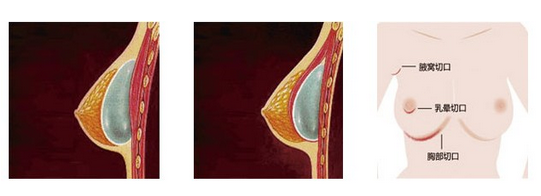 位置较高,术后瘢痕较隐蔽,较容易将乳房假体植入在胸大肌深面。但经此切口难以对胸大肌内下方的起点进行充分的剥离,所形成的腔穴上大下小,术后假体位置高,乳沟不明显,乳房形态不够满意。